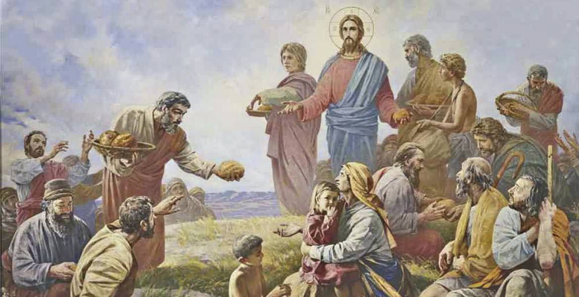 Τότε ο Ιησούς τους απάντησε: «Δεν υπάρχει λόγος να φύγουν, δώστε τους εσείς να φάνε». Οι μαθητές τού λένε: «Δεν έχουμε εδώ, παρά μόνο πέντε ψωμιά και δυο ψάρια». Ο Ιησούς πρόσταξε τον κόσμο να καθίσει στο χορτάρι, πήρε στα χέρια του τα πέντε ψωμιά και τα δύο ψάρια και τα ευλόγησε. Κατόπιν άρχισε να κόβει τα ψωμιά σε κομμάτια και να τα δίνει στους μαθητές, κι οι μαθητές στο πλήθος. Έπειτα μοίρασε σ’ όλους και τα δύο ψάρια. Έφαγαν όλοι και χόρτασαν. Μάζεψαν και τα περισσεύματα από τα κομμάτια, δώδεκα κοφίνια γεμάτα. Αυτοί που έφαγαν ήταν πέντε χιλιάδες και επιπλέον οι γυναίκες και τα παιδιά τους.
